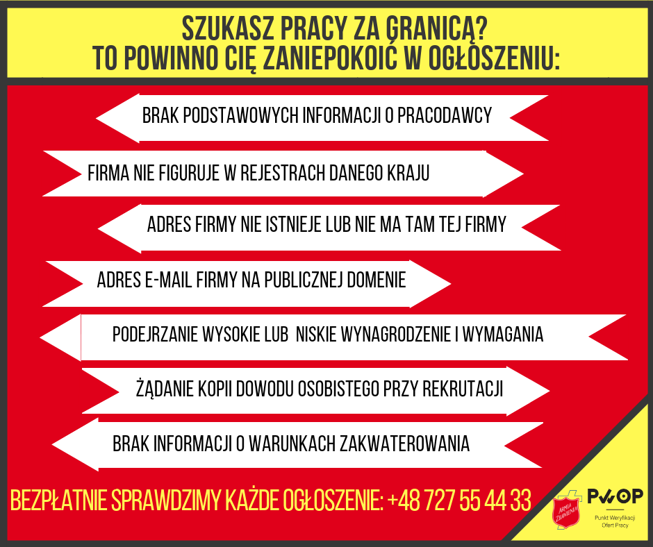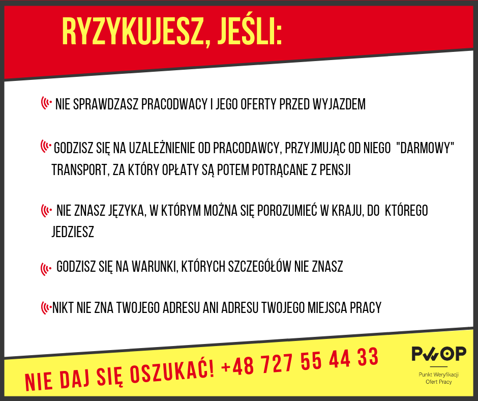 Poniżej przedstawiamy multimedialne plansze informacyjne dotyczące przeciwdziałania handlem ludźmi. Przestrzegają one osoby szukające pracy przed niebezpieczeństwami związanymi z handlem ludźmi oraz ryzykiem, jakie wiąże się z odpowiedzią na ogłoszenia nieuczciwych pracodawców lub przestępców udających pracodawców.