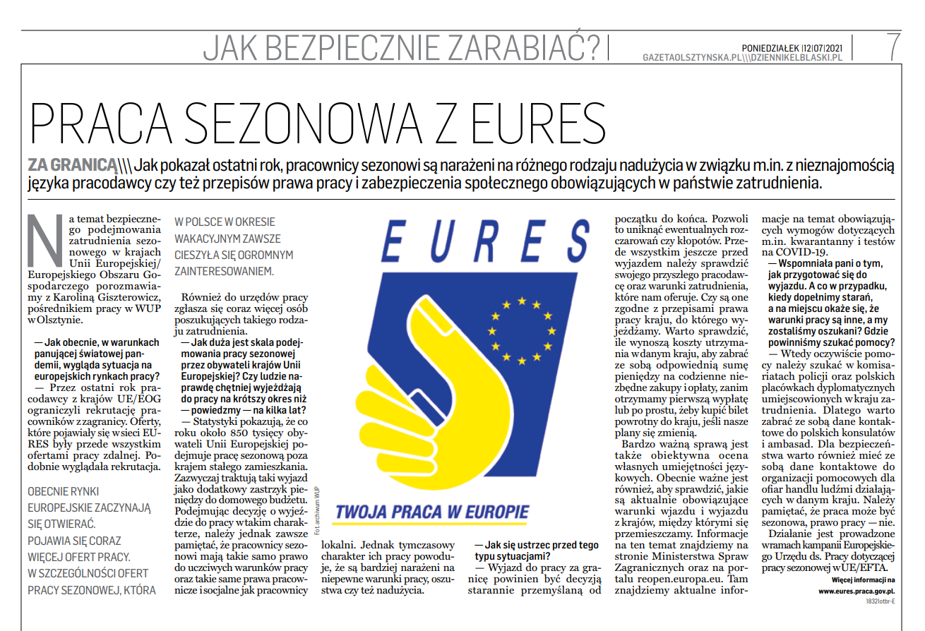 Artykuł Gazety Olsztyńskiej nt. pracy sezonowej z Eures