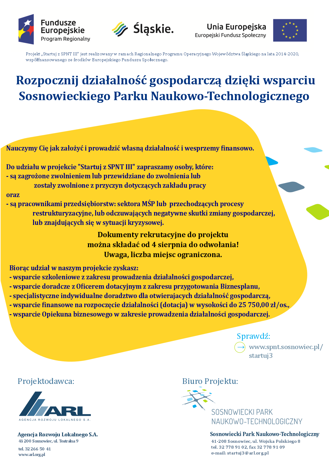 Agencja Rozwoju Lokalnego S.A., Operator Sosnowieckiego Parku Naukowo-Technologicznego, informuje, że nabór do projektu ‘'Startuj z SPNT III'' został przedłużony do dnia 29.09.2017 r.