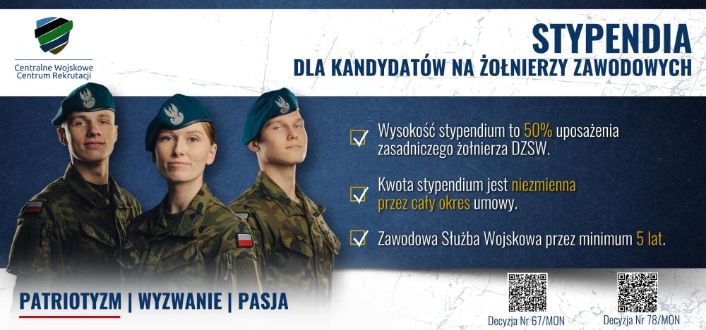 Centralne Wojskowe Centrum Rekrutacji STYPENDIA DLA KANDYDATÓW NA ŻOŁNIERZY ZAWODOWYCH Wysokość stypendium to 50% uposażenia zasadniczego żołnierza DZSW. Kwota Stypendium jest niezmienna przez cały okres umowy. Zawodowa Służba Wojskowa przez minimum 5 lat.PATRIOTYZM WYZWANIE PASJA