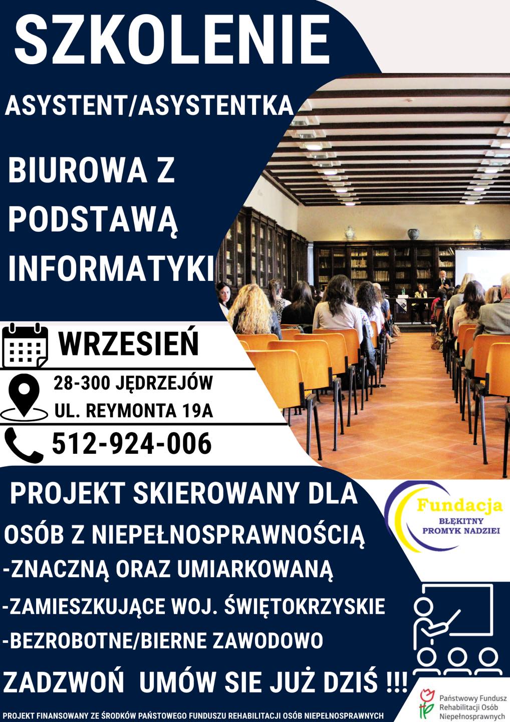 W imieniu Fundacji Błękitny Promyk Nadziei zapraszamy osoby niepełnosprawne do udziału w szkoleniu Asystent/Asystentka Biurowa z podstawą informatyki - Powiatowy Urząd Pracy w Jędrzejowie