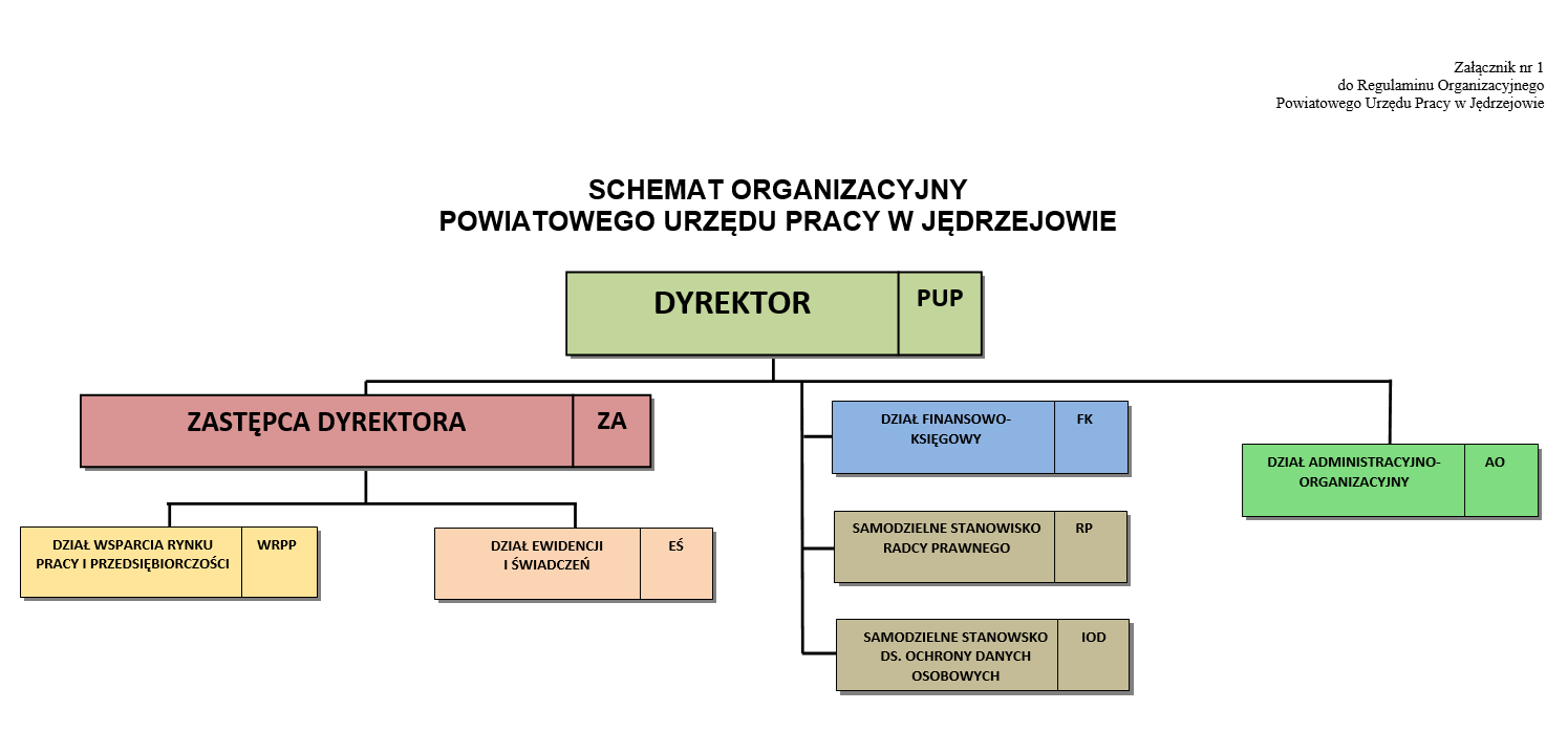 Regulamin organizacyjny Powiatowego Urzędu Pracy w Jędrzejowie określa zasady wewnętrznej organizacji oraz strukturę i zakres działania komórek organizacyjnych, wchodzących w jego skład.