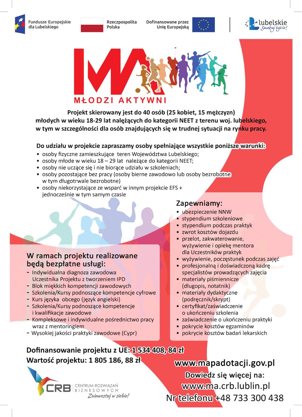 W związku z  trwającą rekrutacją do projektu pn. „Młodzi - Aktywni” nr projektu: FELU.09.02-IP.02-0009/23  Priorytetu IX Zaspokajanie potrzeb rynku pracy, Działania 9.2 Aktywizacja zawodowa  Programu Fundusze Europejskie dla Lubelskiego 2021-2027 przekazujemy Państwu informację na temat powyższego projektu.